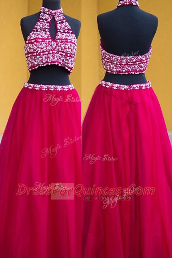 Customized Halter Top Satin Sleeveless Floor Length Prom Party Dress and Beading