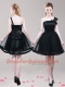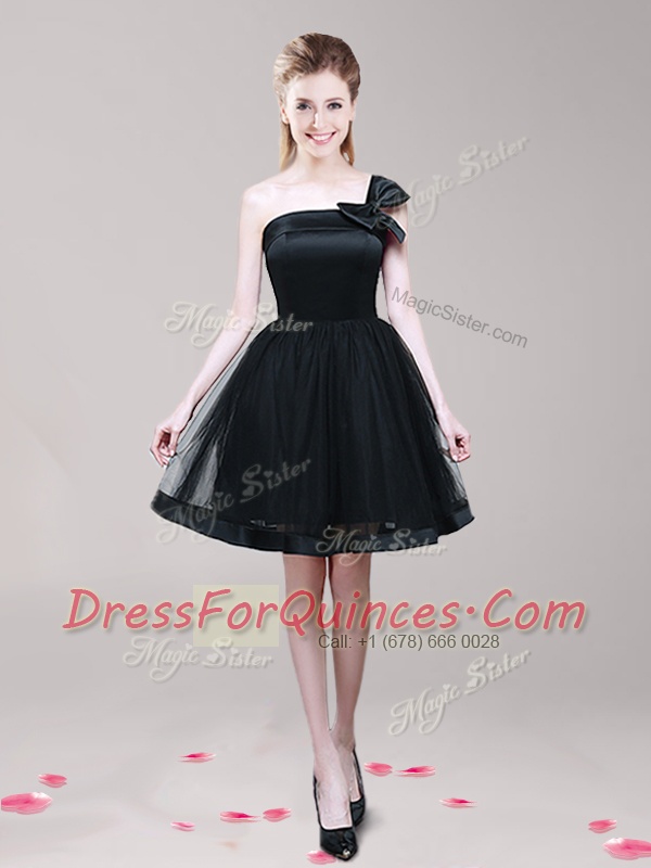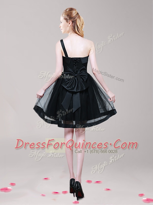 Cute One Shoulder Sleeveless Tulle Mini Length Zipper Prom Gown in Black with Bowknot
