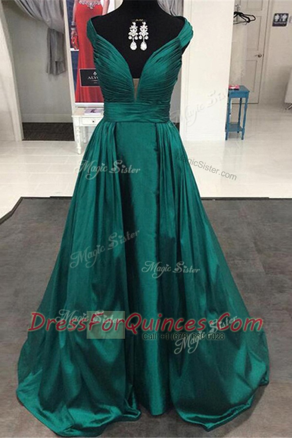 Deluxe Teal Satin Zipper Off The Shoulder Sleeveless Prom Evening Gown Sweep Train Pleated