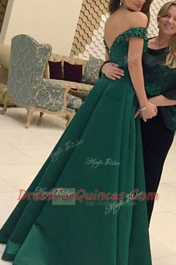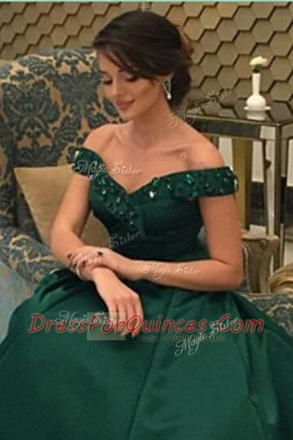 Discount Off the Shoulder Floor Length Dark Green Dress for Prom Satin Short Sleeves Beading