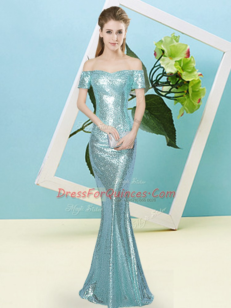 Floor Length Mermaid Short Sleeves Aqua Blue Zipper