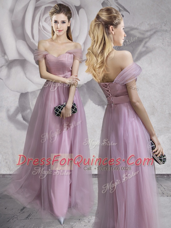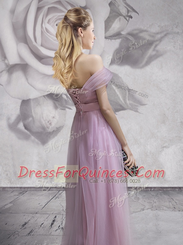 High End Lavender Lace Up Off The Shoulder Lace and Ruching and Bowknot and Hand Made Flower Tulle Sleeveless