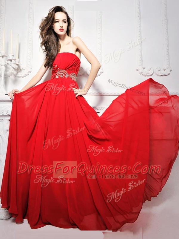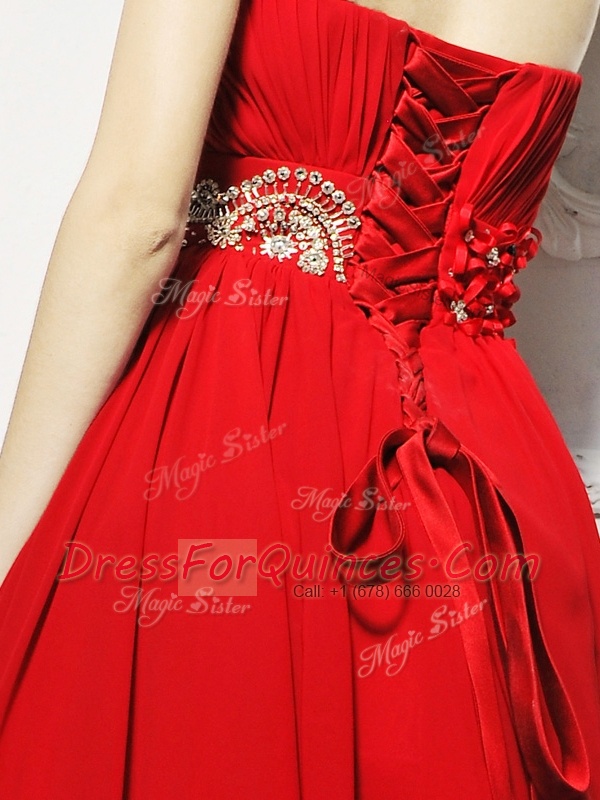High Quality With Train Lace Up Prom Party Dress Red for Prom and Party with Beading and Ruching Brush Train