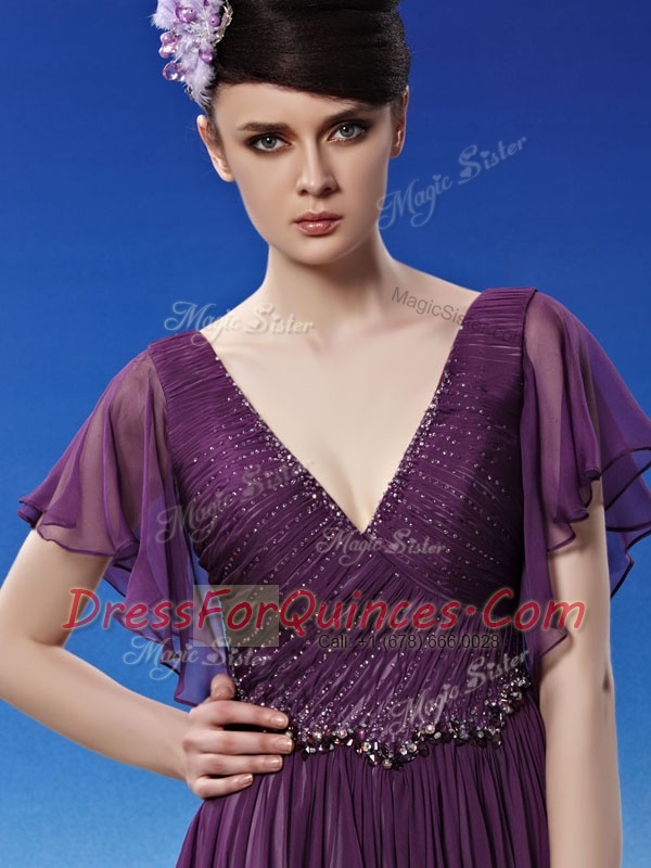 Ideal V-neck Short Sleeves Side Zipper Evening Dress Dark Purple Chiffon