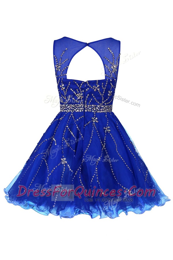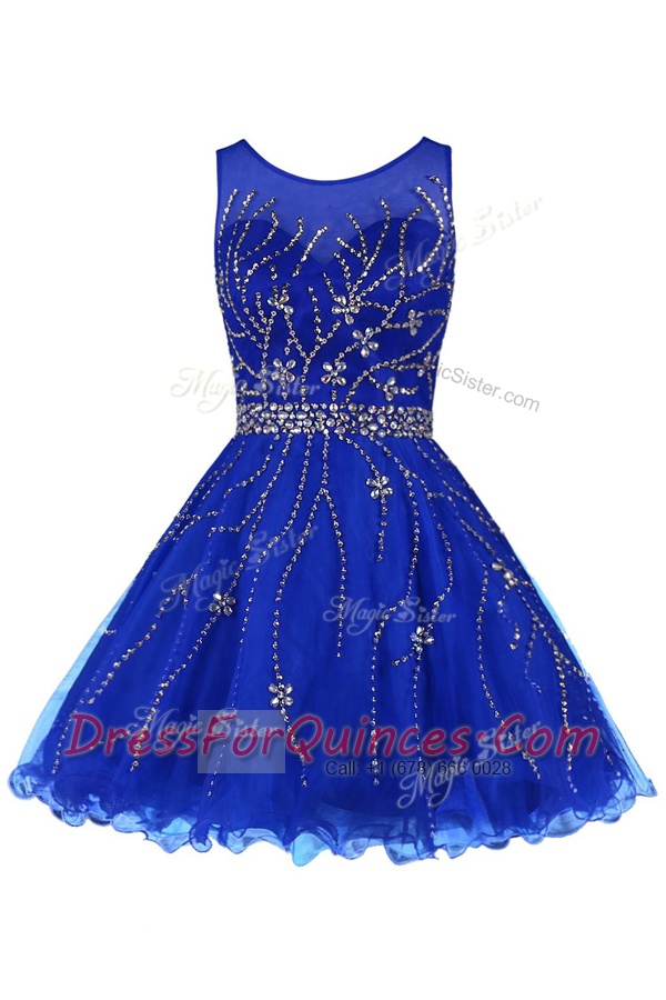Knee Length Royal Blue Dress for Prom Tulle Sleeveless Beading