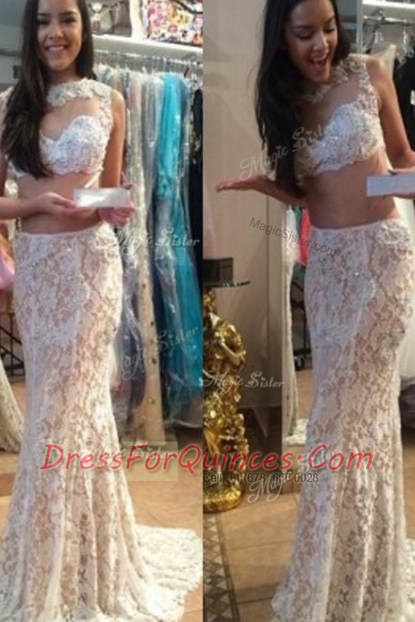 Mermaid Scoop Lace Sleeveless With Train Beading Zipper Evening Dress with White Brush Train