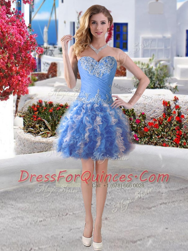 Mini Length Blue Prom Dress Organza Sleeveless Appliques and Ruffles