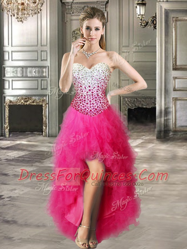 Modest A-line Prom Dresses Hot Pink Sweetheart Tulle Sleeveless High Low Lace Up