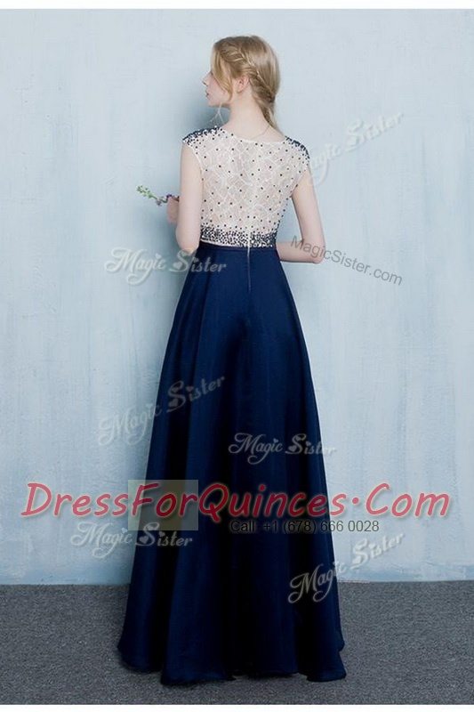 Navy Blue Column/Sheath Scoop Cap Sleeves Chiffon Floor Length Zipper Beading and Ruching Evening Dress