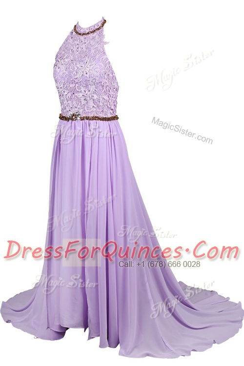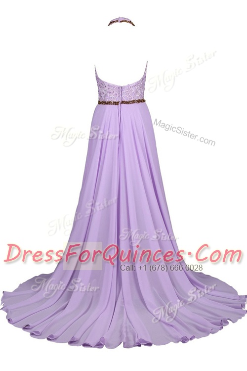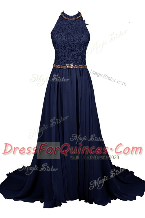 Noble Halter Top Lace Sleeveless Floor Length Beading Zipper Homecoming Dress with Navy Blue