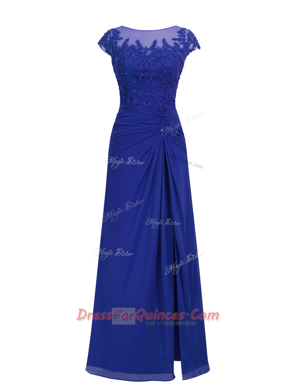 Royal Blue A-line Chiffon Scoop Cap Sleeves Appliques Floor Length Zipper Prom Evening Gown