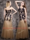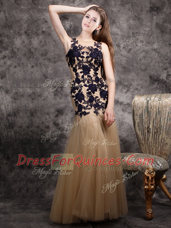 Spectacular Mermaid Scoop Sleeveless Tulle Floor Length Side Zipper Prom Evening Gown in Champagne with Lace and Appliques
