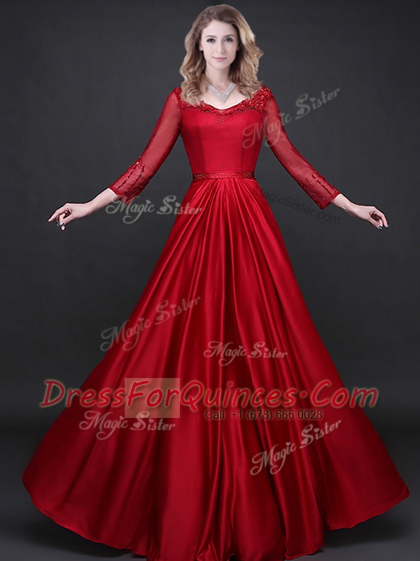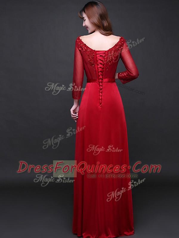Sumptuous Wine Red Long Sleeves Floor Length Appliques and Belt Lace Up Prom Party Dress