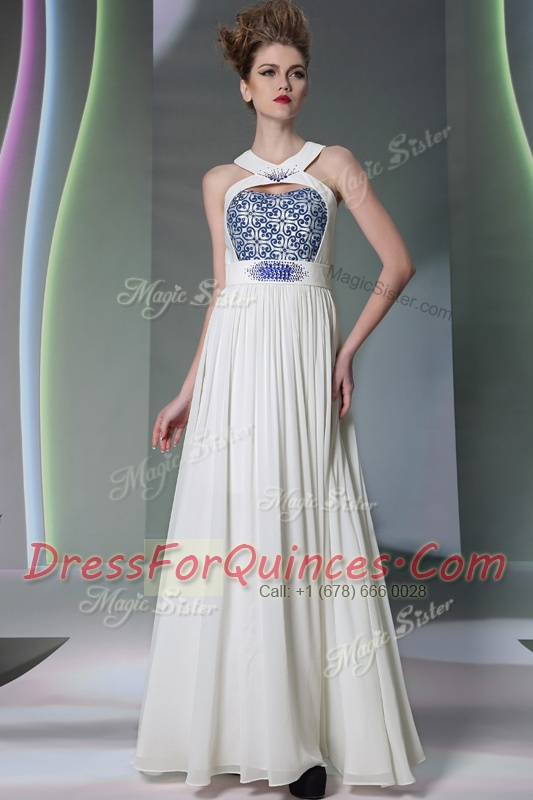 Super White Chiffon Zipper Halter Top Sleeveless Floor Length Prom Dress Beading and Embroidery