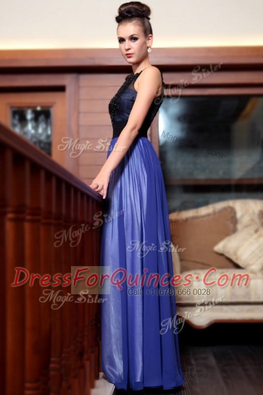 Superior Blue And Black Side Zipper Prom Gown Beading and Appliques Sleeveless Floor Length
