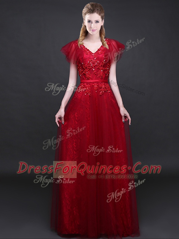 V-neck Short Sleeves Zipper Wine Red Tulle and Lace