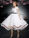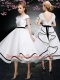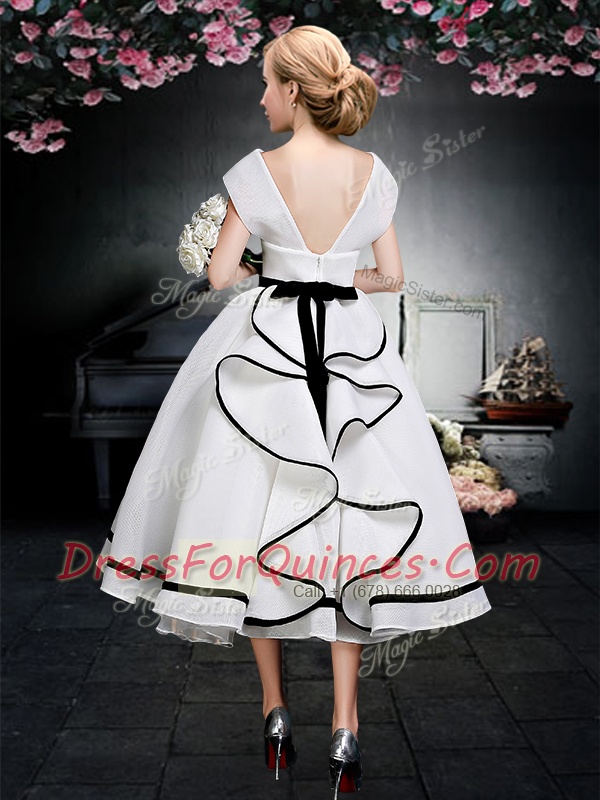 White Chiffon Zipper V-neck Cap Sleeves Tea Length Prom Gown Lace