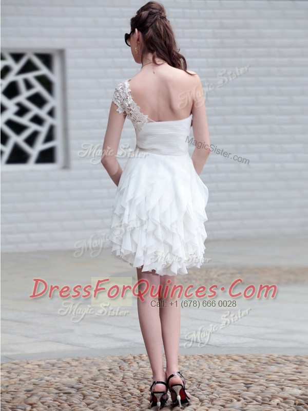 White One Shoulder Neckline Lace and Ruffles Prom Evening Gown Sleeveless Zipper
