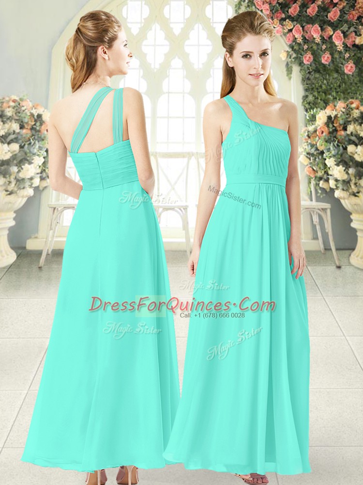 Wonderful Aqua Blue Chiffon Zipper Prom Gown Sleeveless Ankle Length Ruching