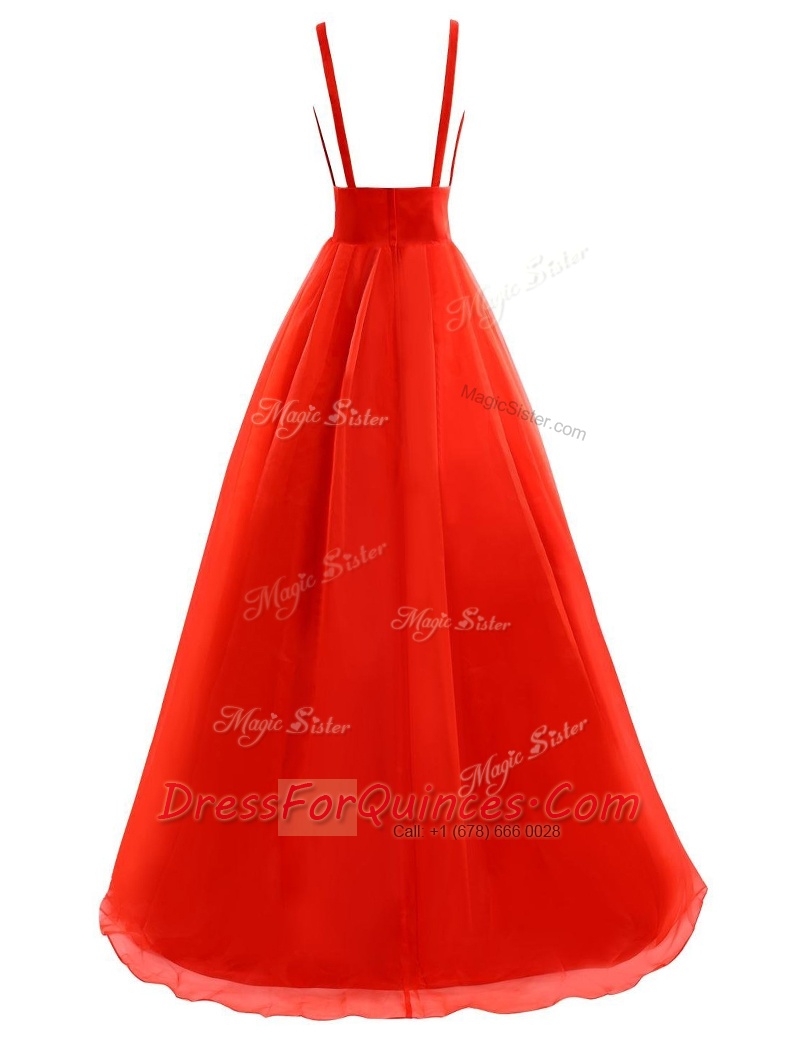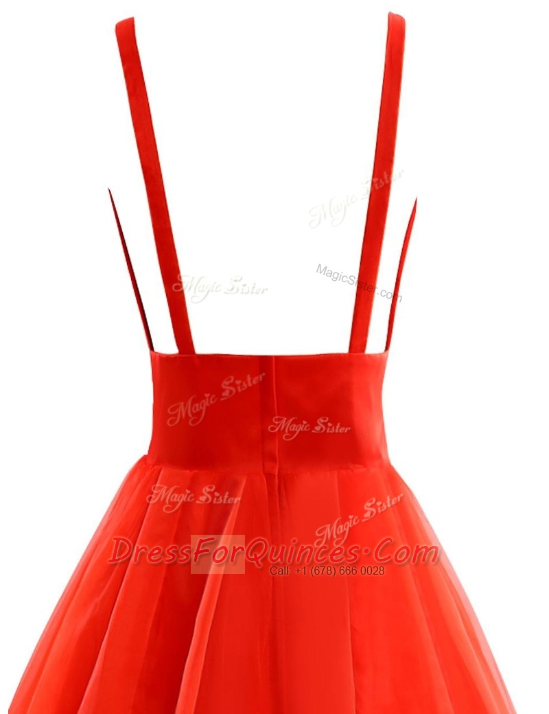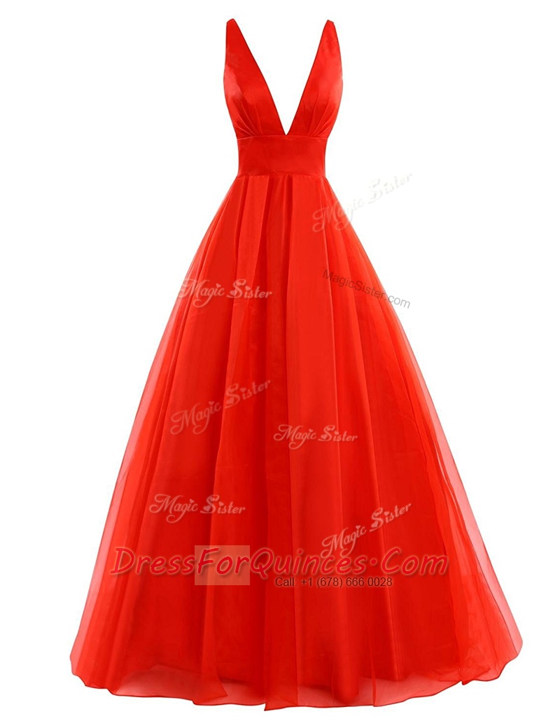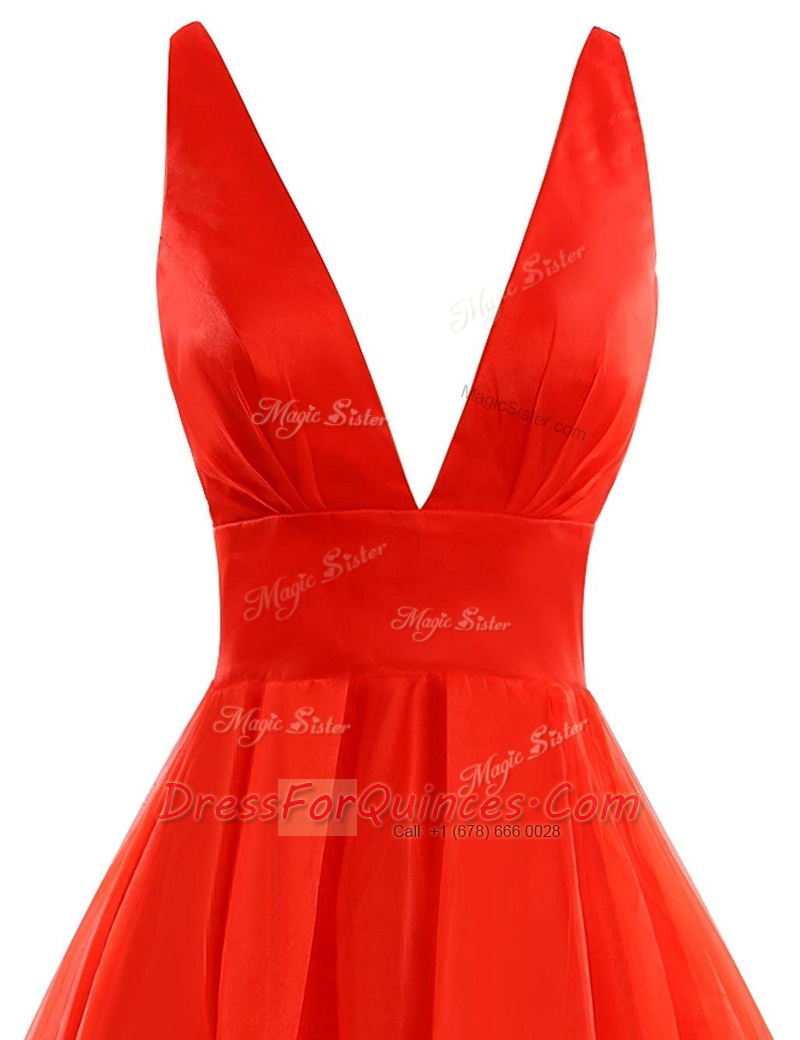 Wonderful Coral Red Organza Zipper V-neck Sleeveless Prom Party Dress Brush Train Pleated