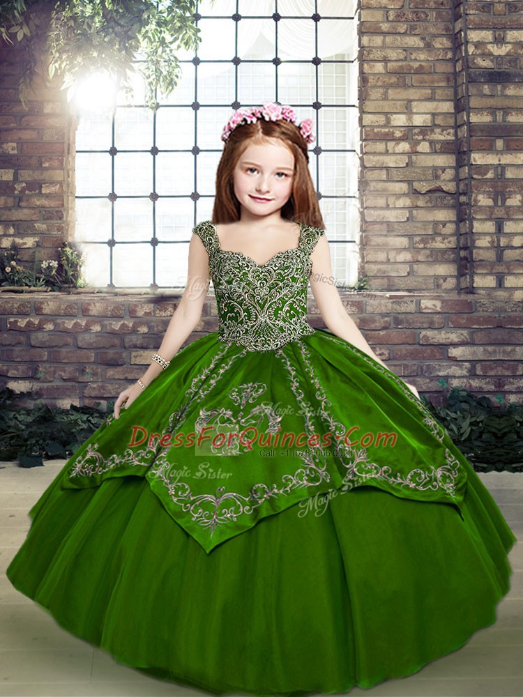 Dramatic Straps Sleeveless Pageant Dress for Girls Floor Length Beading and Embroidery Green Tulle
