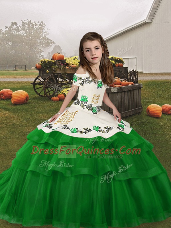 Fancy Green Ball Gowns Straps Sleeveless Tulle Floor Length Lace Up Embroidery and Ruffled Layers Pageant Dress for Girls