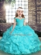 Fancy Sleeveless Organza Floor Length Lace Up Pageant Dress for Teens in Aqua Blue with Beading and Ruffles