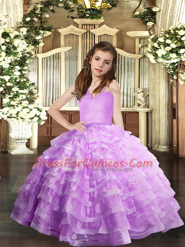 Latest Lavender Ball Gowns Organza Straps Sleeveless Ruffled Layers Floor Length Lace Up Pageant Dress for Womens
