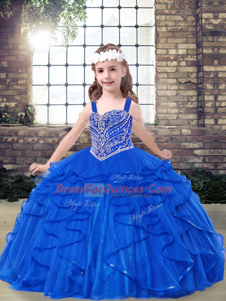 Royal Blue Tulle Lace Up Straps Sleeveless Floor Length Pageant Dress for Girls Beading and Ruffles