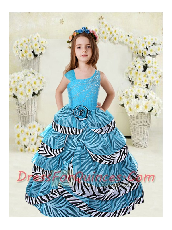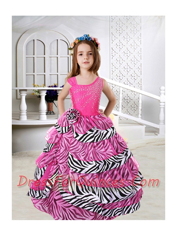 2014 Beautiful Hot Pink Asymmetrical Beading Zebra Little Girl Pageant Dresses with Ruffled Layers