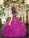 Admirable Fuchsia Tulle Lace Up V-neck Sleeveless Floor Length Little Girl Pageant Gowns Beading and Ruffles