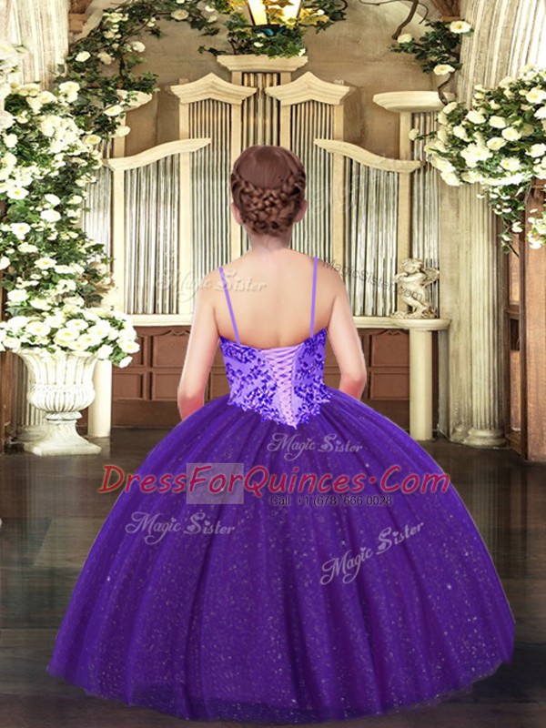 Adorable Spaghetti Straps Sleeveless Pageant Gowns For Girls Floor Length Appliques Olive Green Tulle