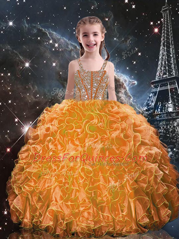 Ball Gowns Little Girls Pageant Gowns Orange Red Straps Organza Sleeveless Floor Length Lace Up