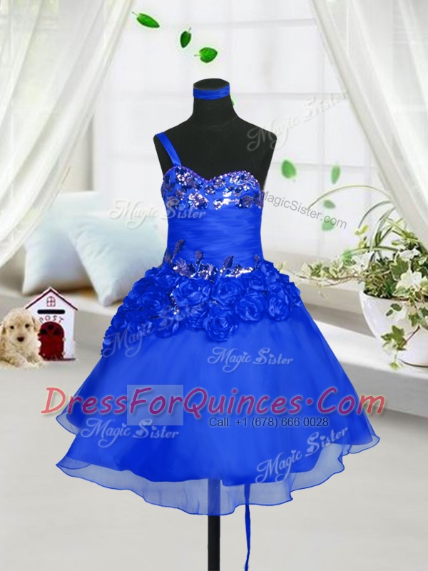Blue A-line Beading and Hand Made Flower Little Girls Pageant Dress Wholesale Lace Up Organza Sleeveless Knee Length