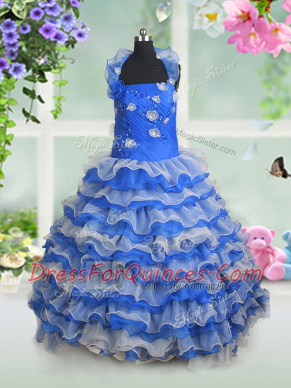 Custom Design Ruffled Ball Gowns Little Girls Pageant Gowns Blue And White Halter Top Organza Sleeveless Floor Length Lace Up