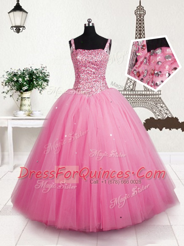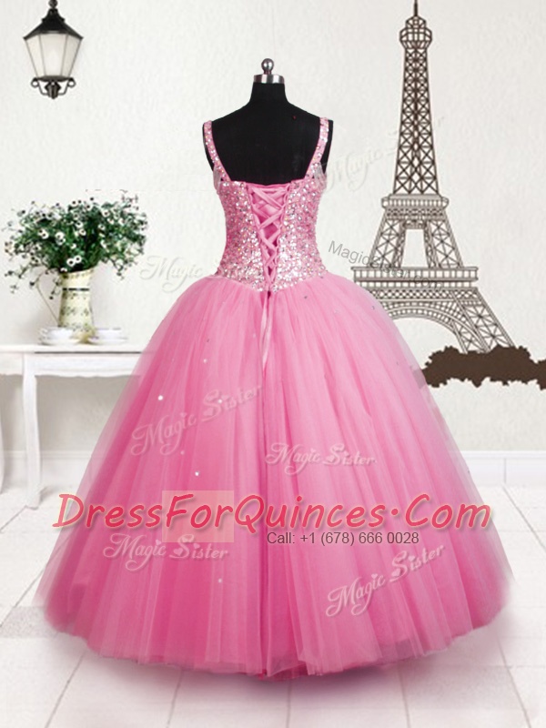 Custom Fit Beading and Sequins Girls Pageant Dresses Baby Pink Lace Up Sleeveless Floor Length
