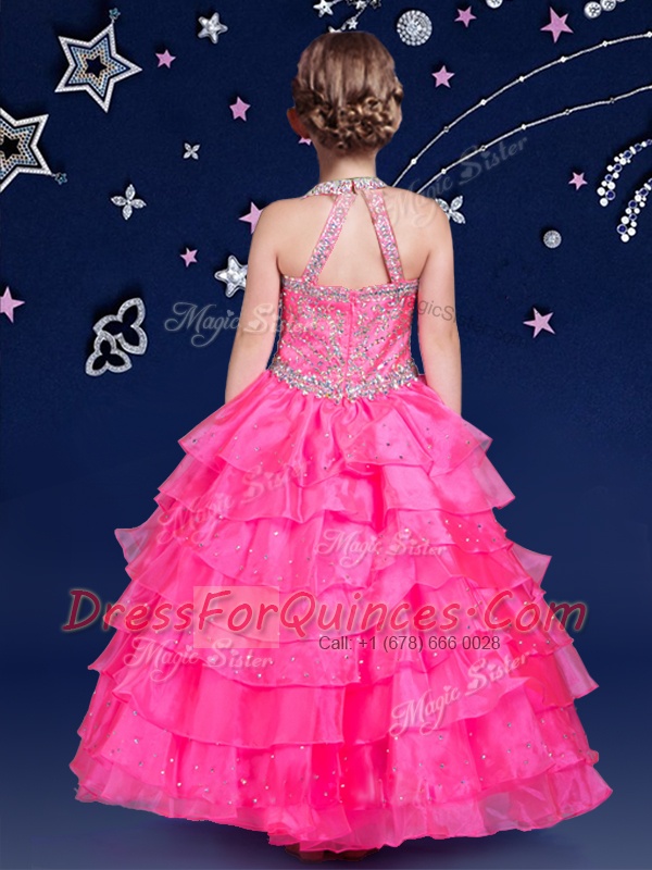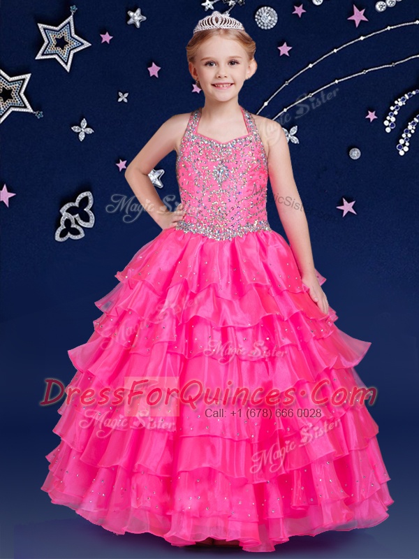 Discount Halter Top Hot Pink Organza Zipper Little Girls Pageant Gowns Sleeveless Floor Length Beading and Ruffled Layers