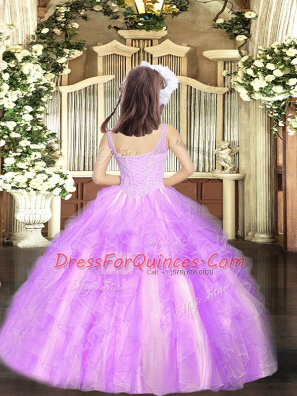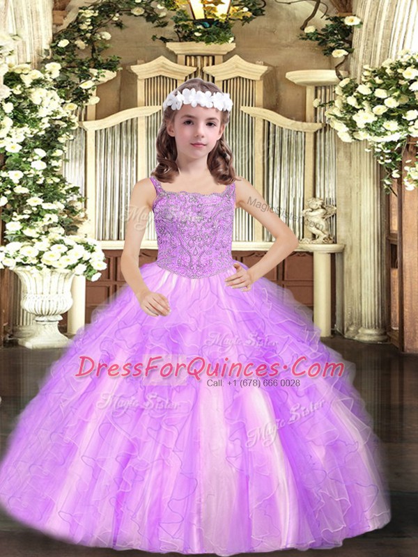 Fancy Straps Sleeveless Lace Up Little Girl Pageant Gowns Lilac Organza