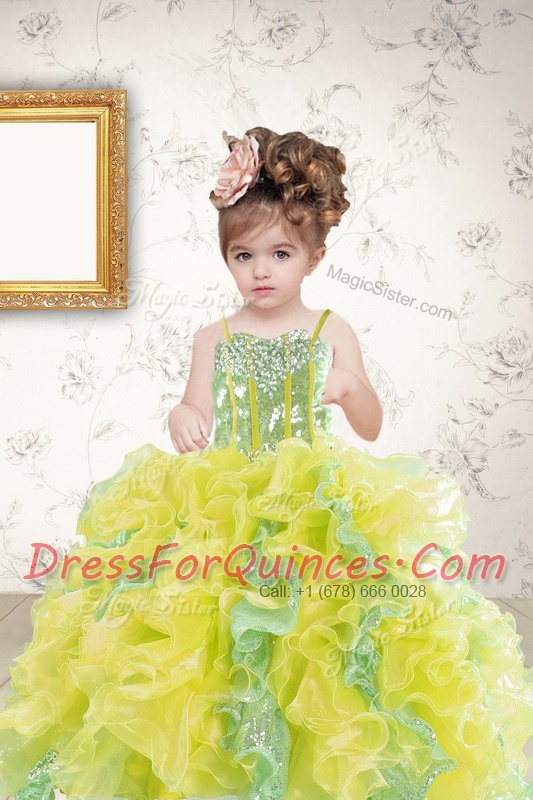 Glamorous Spaghetti Straps Sleeveless Kids Pageant Dress Floor Length Beading and Ruffles and Sequins Multi-color Organza