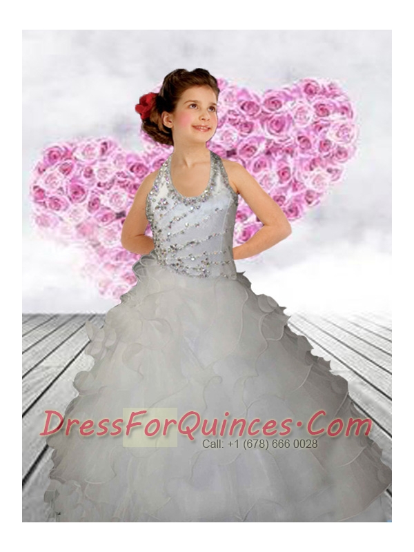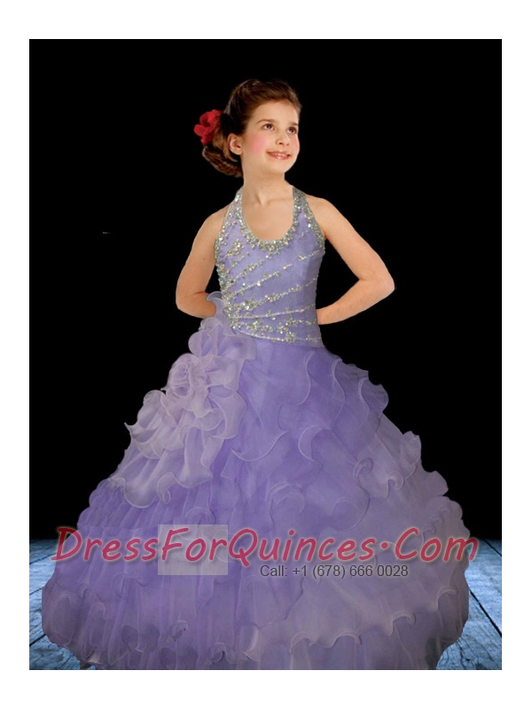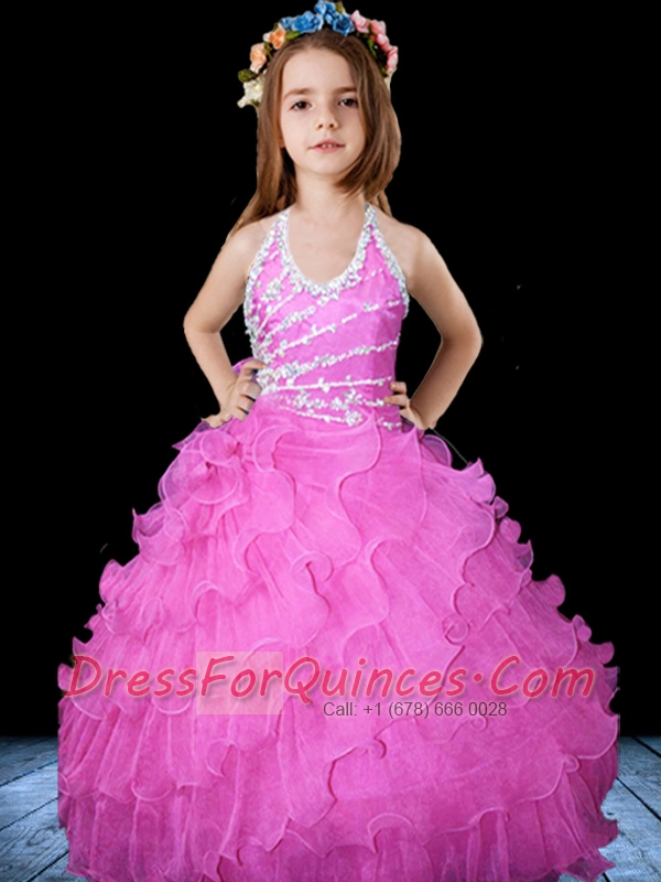 Hot Pink Halter Floor-length Little Gril Pageant Dress with Beading
