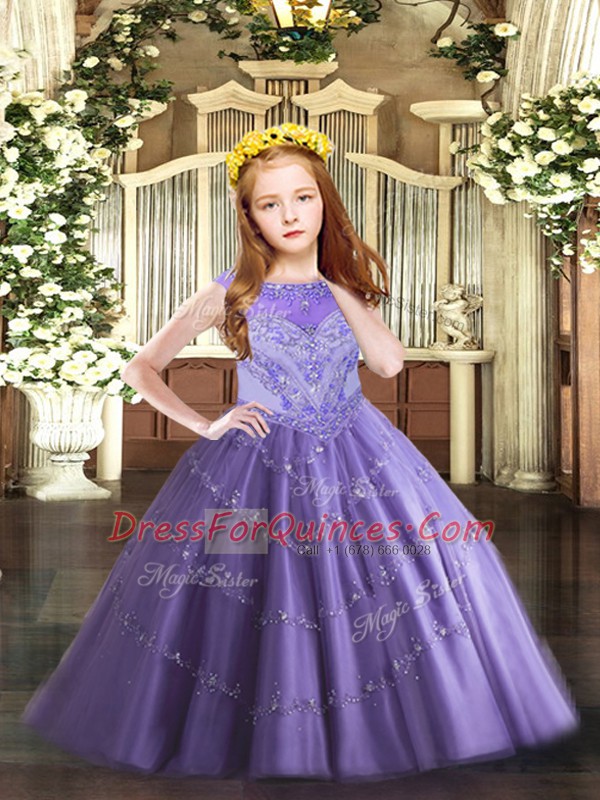 Lavender Sleeveless Floor Length Beading and Appliques Zipper Child Pageant Dress