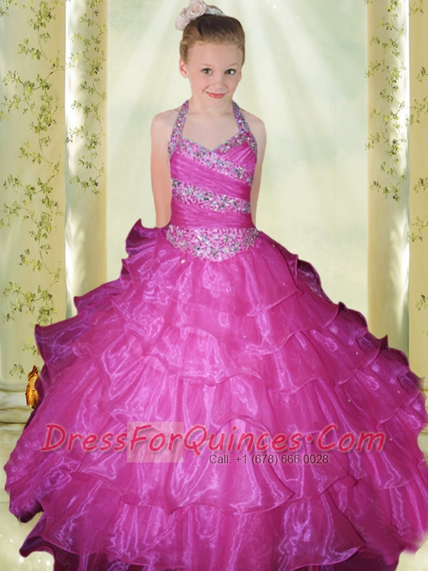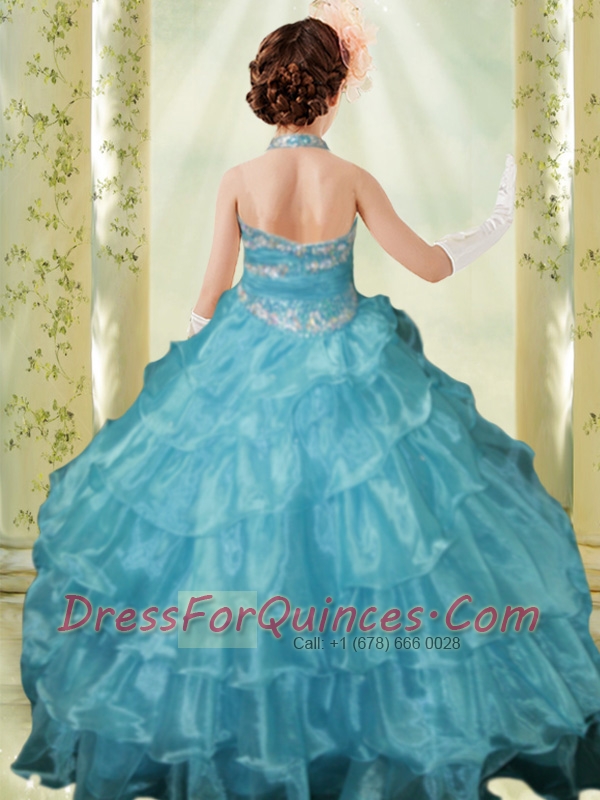 Light Blue Ball Gown Blue Halter Little Gril Pageant Dress with Beading