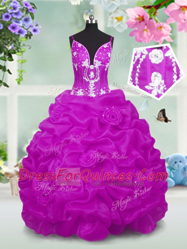 Luxurious Fuchsia V-neck Neckline Beading and Appliques and Pick Ups Child Pageant Dress Sleeveless Lace Up