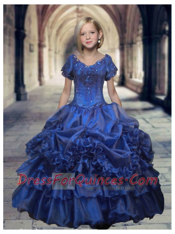 Luxurious Royal Blue V-neck Short Sleeves Beaded Decorate Little Girl Pageant Dress