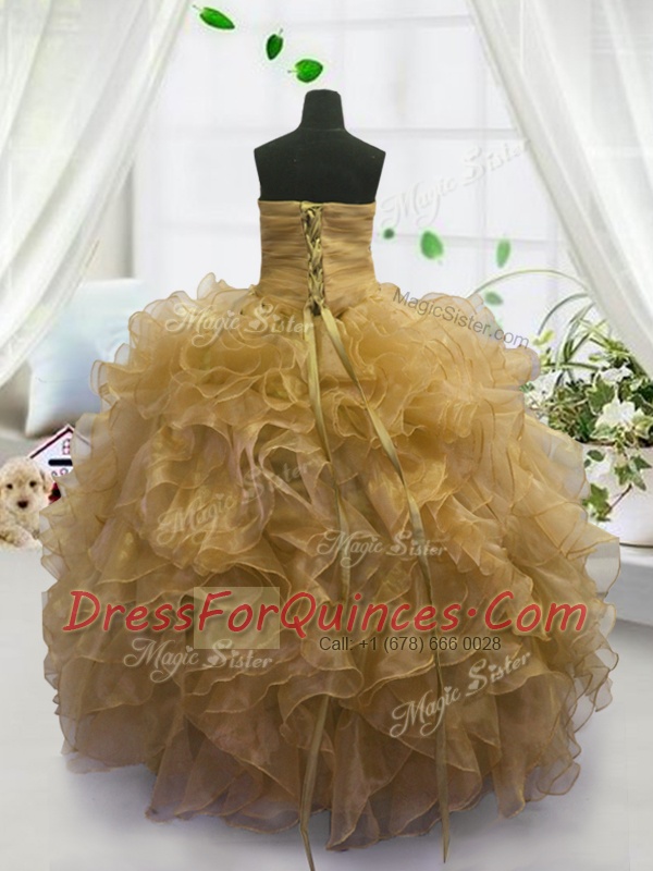 Popular Gold Sleeveless Organza Lace Up Little Girls Pageant Dress for Party and Wedding Party