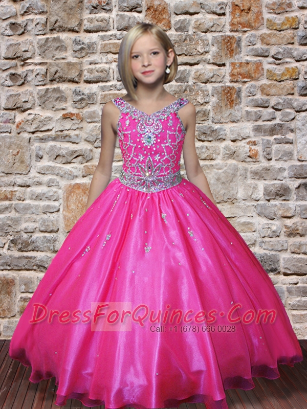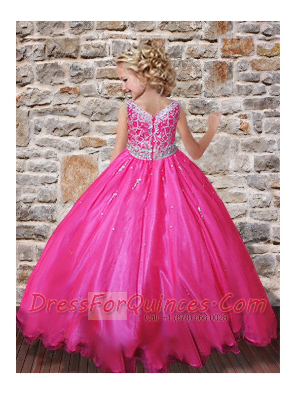 Pretty V-neck Hot Pink 2014 Little Gril Pageant Dresses with Beading