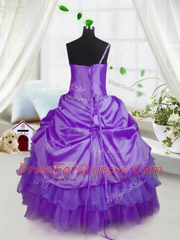 Purple Ball Gowns Beading and Ruffled Layers and Pick Ups Little Girl Pageant Dress Lace Up Organza Sleeveless Floor Length