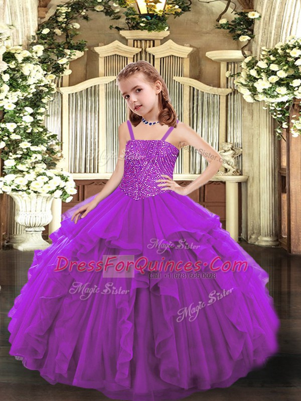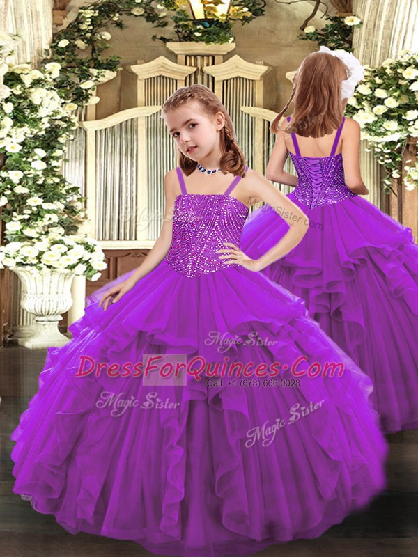Purple Lace Up Little Girls Pageant Gowns Beading and Ruffles Sleeveless Floor Length