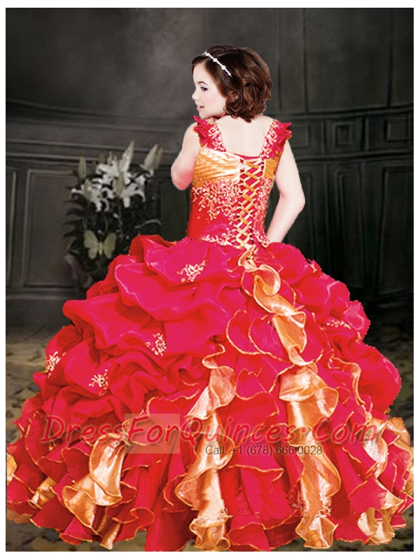 Red Straps Ball Gown 2014 Little Girl Pageant Dress with Ruffles with Appliques