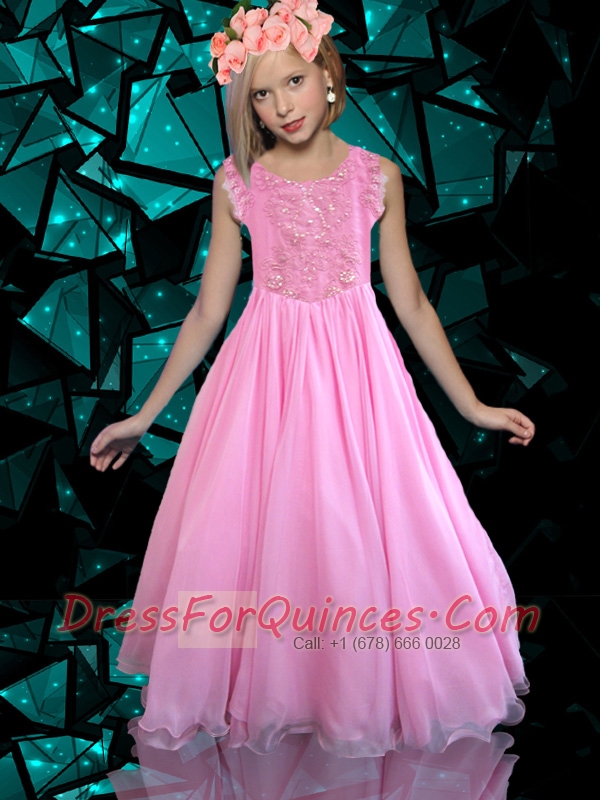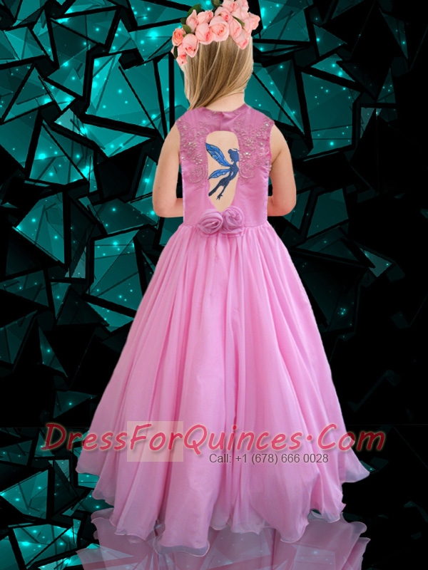 Rose Pink Scoop Backless Little Gril Pageant Dress with Appliques Hand Made Flowers